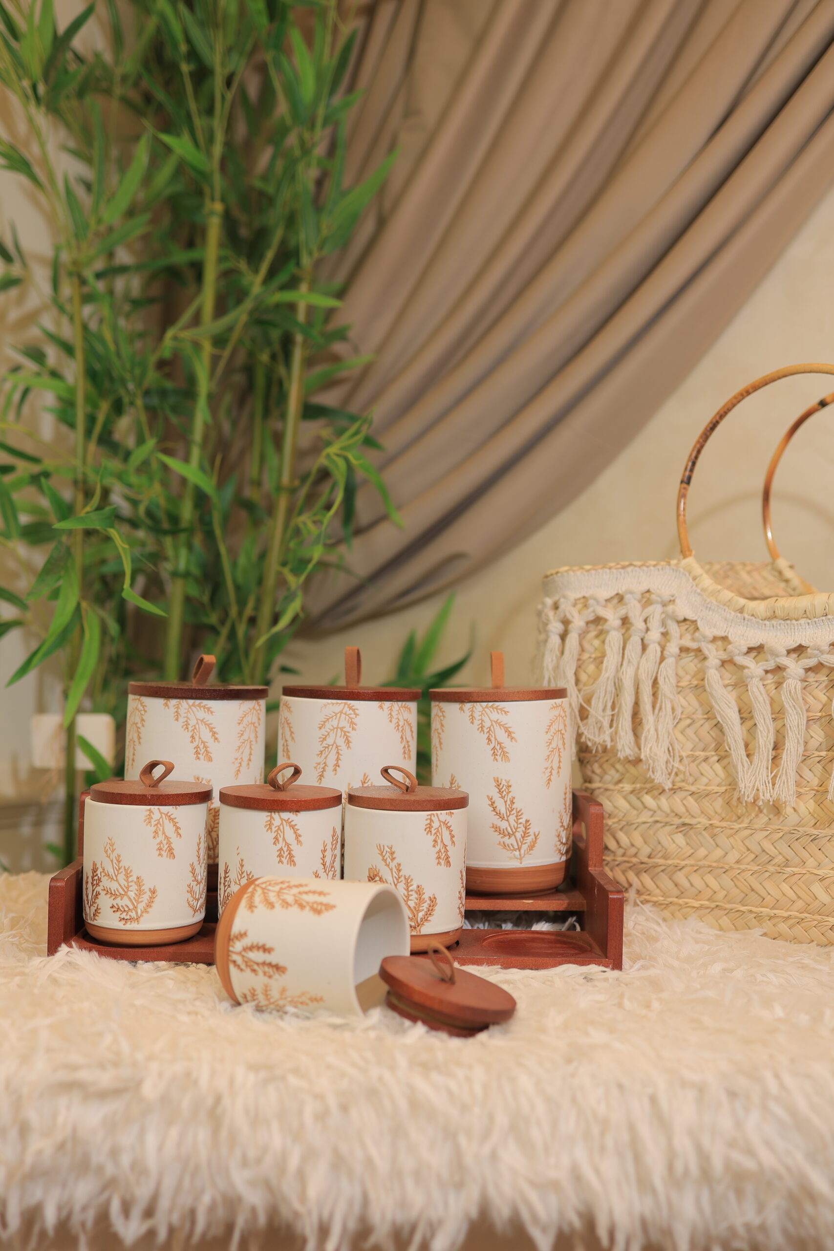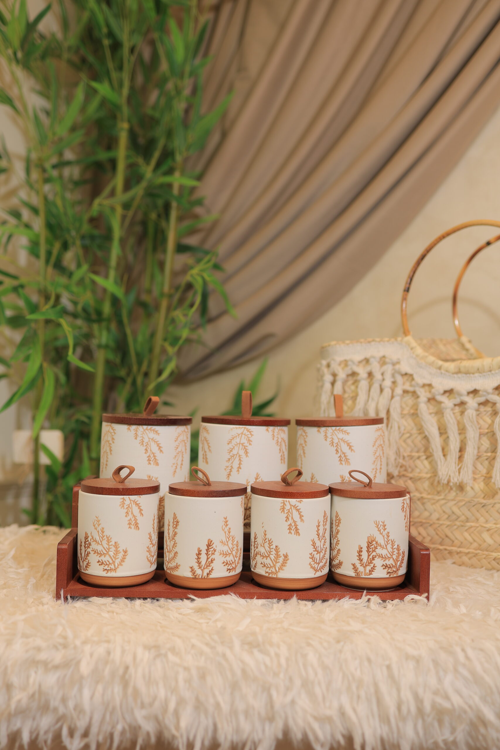 طقم توابل بورسلين مرسوم غطاء خشب 7 قطع بالاستاند